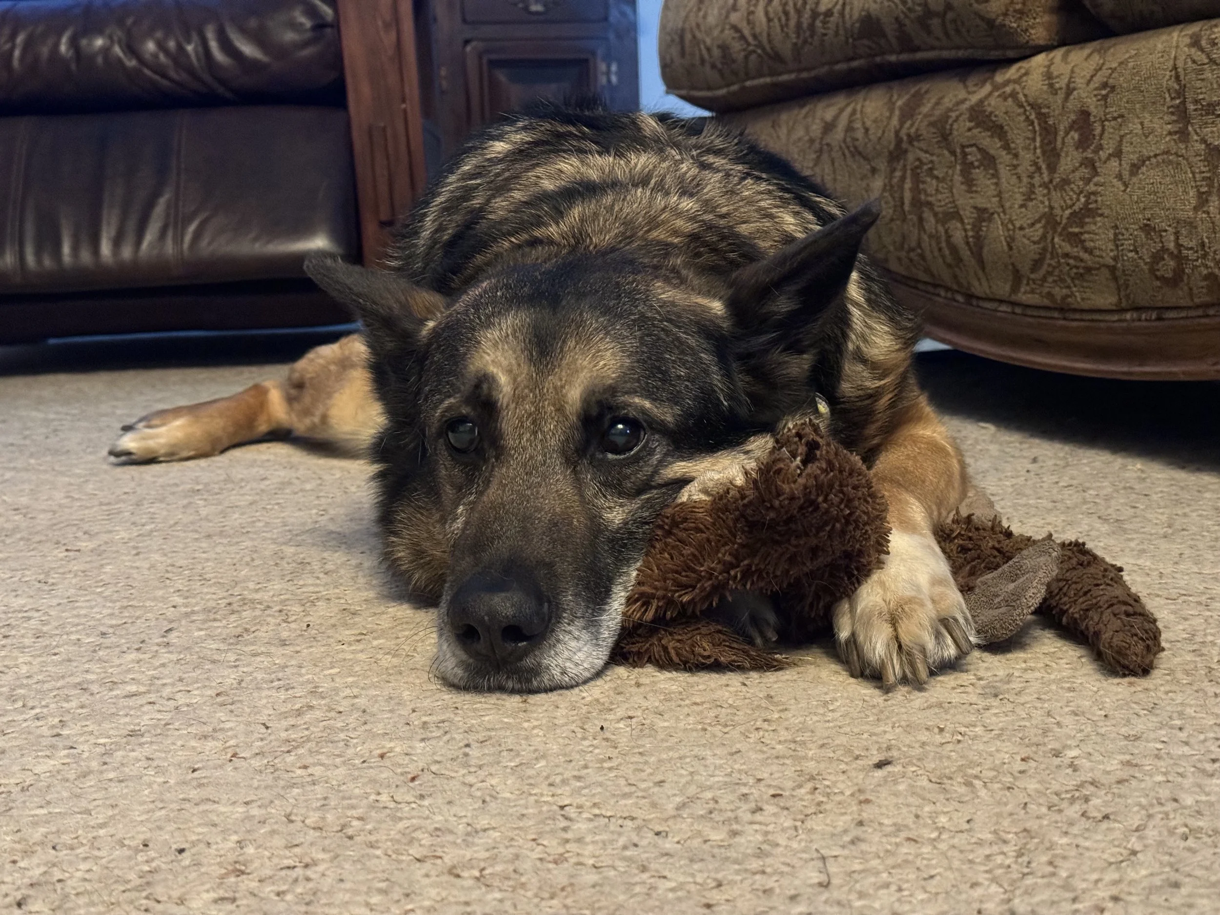 A gentle, ancient, mostly deaf German Shepherd who will follow you room to room and simply lie down nearby. He doesn't demand much — except occasionally a head rub. He sheds impressively, moves slowly on his wobbly back legs. Scooby is our fourth senior dog to live out his days here — we are, apparently, a retirement home for good dogs waiting to be called across the rainbow bridge.